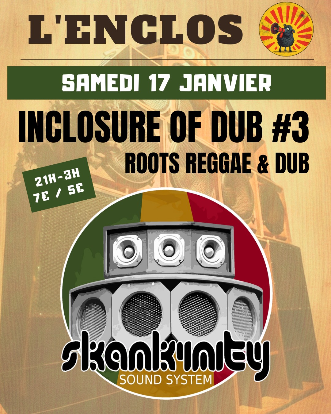 Né en 2016 à Tayrac, le crew Skank'Inity Sound System revient poser ses basses pour une session qui s’annonce mémorable. Après avoir fait trembler les murs du Florida et tourné de Bordeaux à Toulouse, les 4 selectas/opérateurs (Fabrice, Valentin, Pauline et Marc) reviennent jouer à l'Enclos !