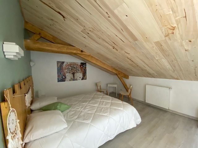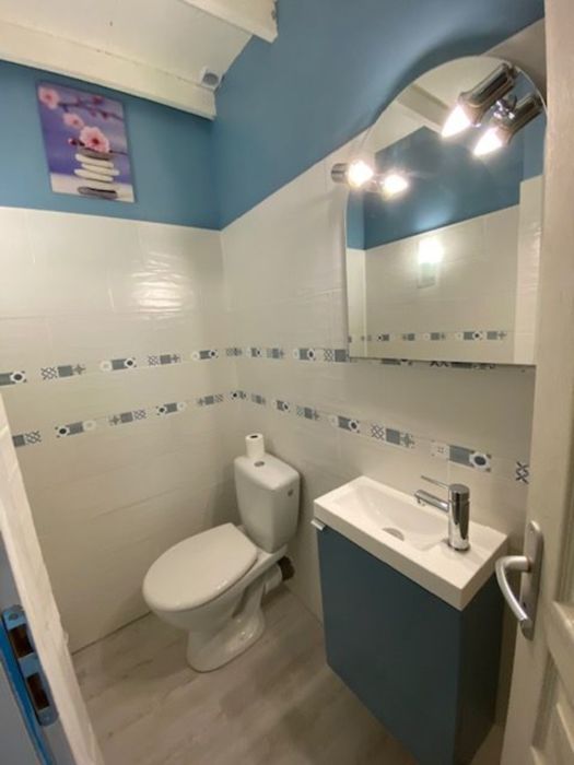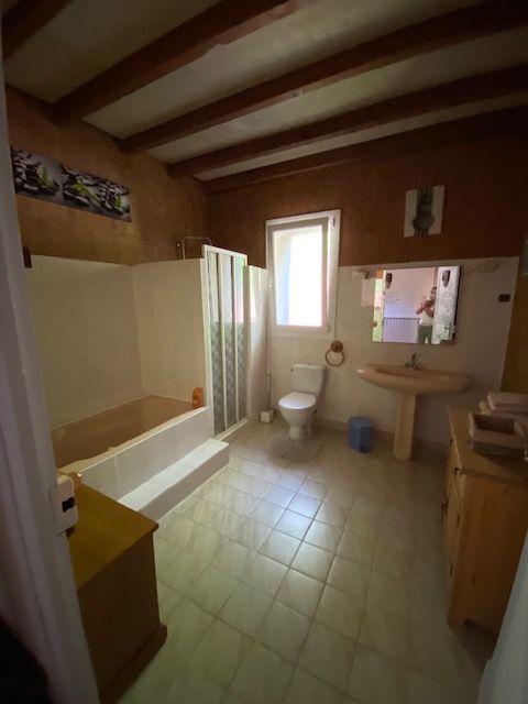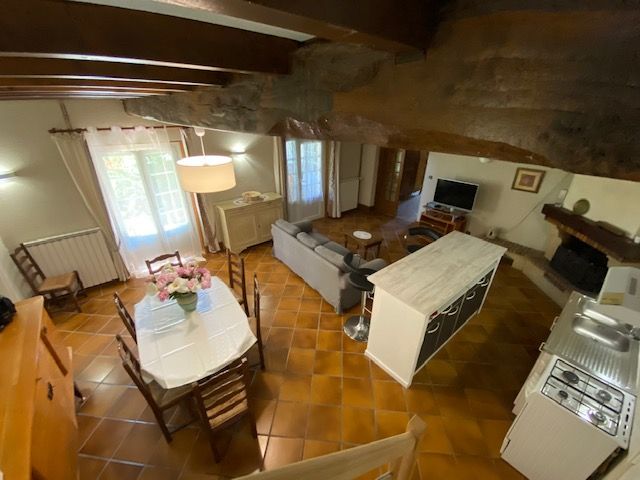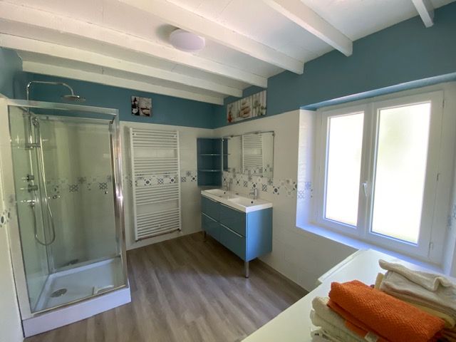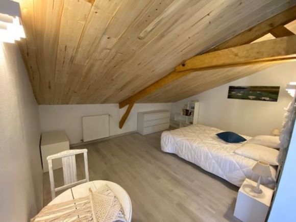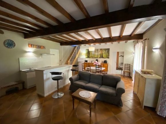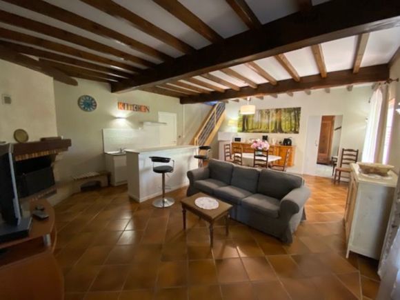 The ground floor accommodation comprises a living room with kitchen, dining area and lounge (sofa, fireplace, table and chairs), a bedroom (1 double bed), a shower room with toilet. 1st floor: 1 air-conditioned bedroom (1 x 160cm bed), 1 air-conditioned bedroom (2 x 0.80cm beds), shower room (washing machine), 1 separate WC with washbasin. Terrace with garden furniture and barbecue, flower garden in front of the terrace. Shared table tennis table.