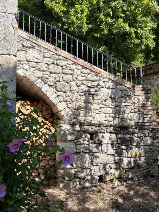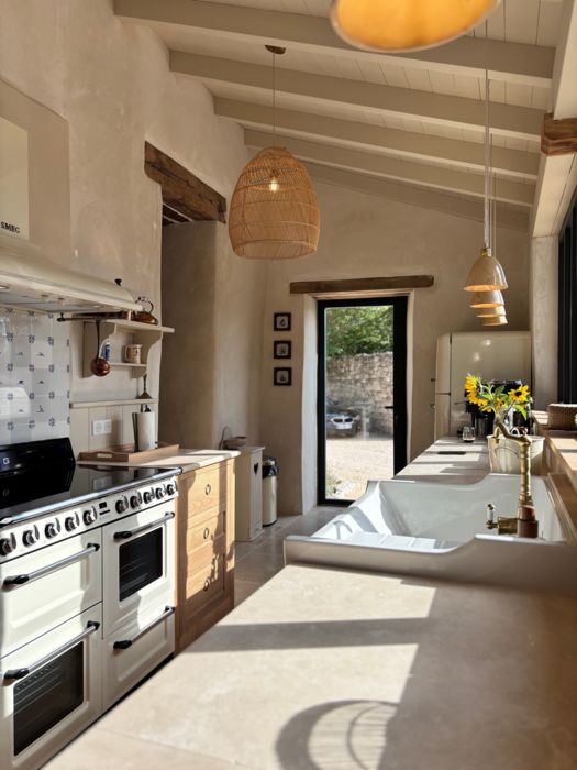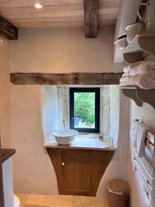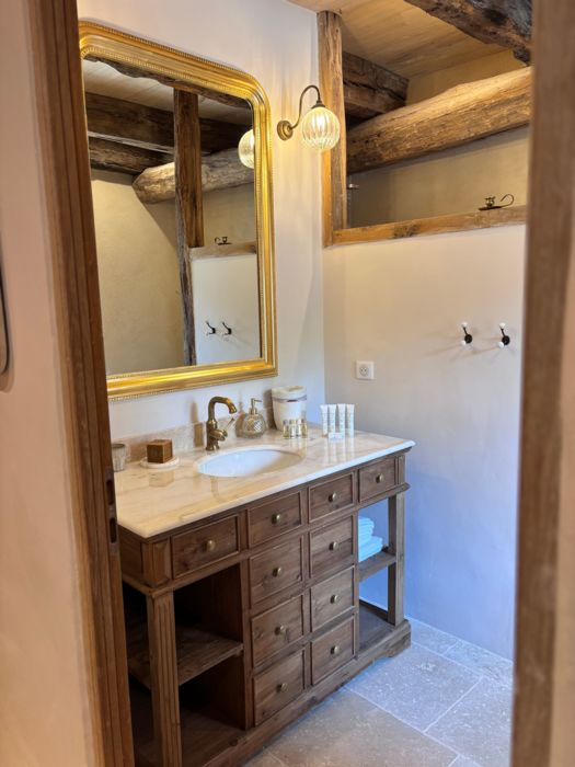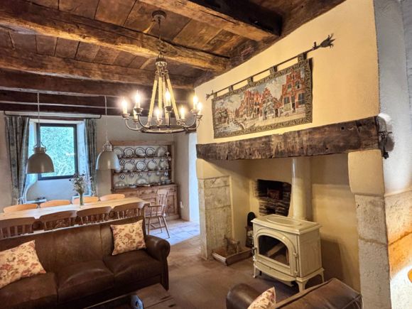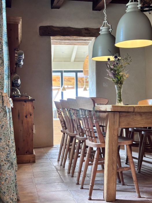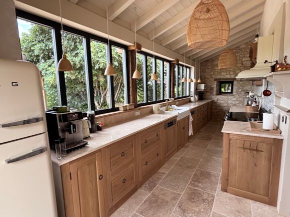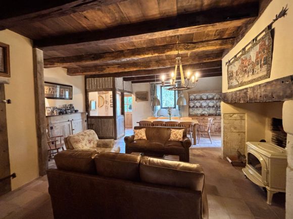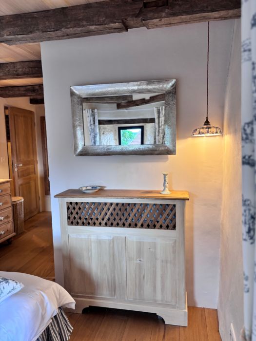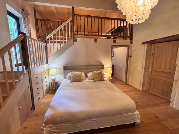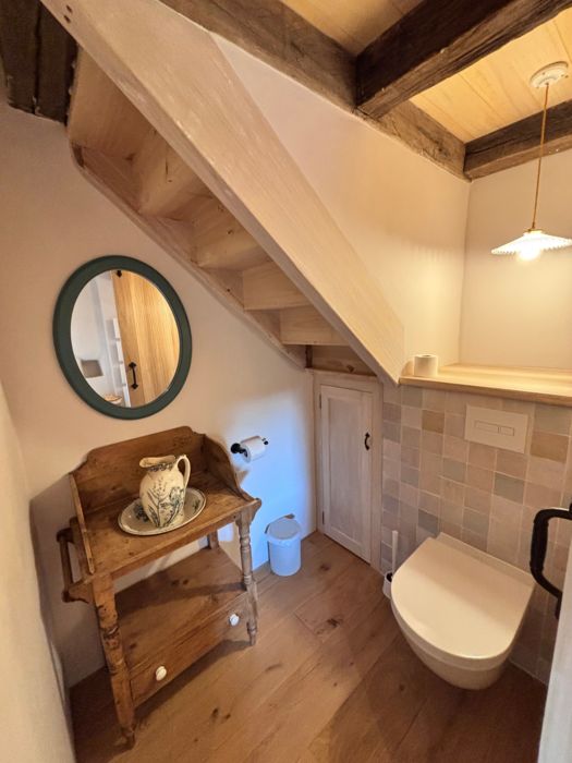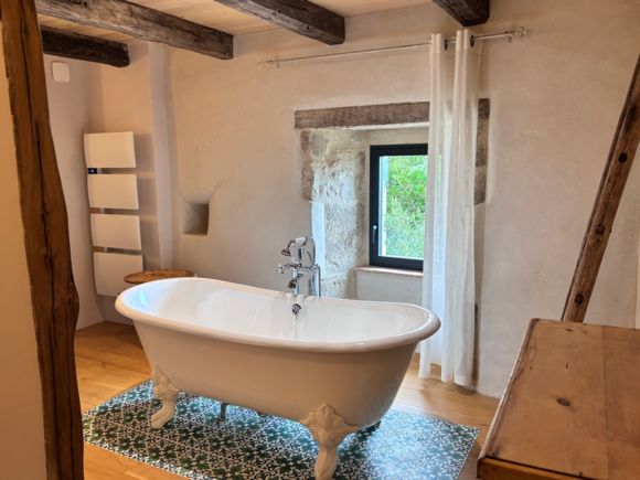 As soon as you enter the front door, you feel the warm atmosphere of the living room with its lounge area (table and chairs, wood-burning stove, armchairs and sofas), then down a step into the bright kitchen with its 3 bay windows (a huge work surface with top-of-the-range equipment (2 dishwashers, kitchen piano with oven, sink, fridge, freezer), and opposite the library with TV and study area. From the entrance hall with its old half-timbering, the master bedroom with 1 double bed (180cm), a shower room and a separate toilet. Off this hallway is a utility room with washing machine, tumble dryer and central steam boiler. On the 1st floor, 3 sublime bedrooms, each with a private shower room and wc. The bedroom with mezzanine for children (desk and games available), 1 bed 180, a large bathroom (central bath and shower) wc. This room has its own private terrace with garden furniture and deckchairs. The green room with 1 bed 180, private shower room and wc and the blue room with 2 beds 0,90 closeable, private shower room and wc. Each room tells its own story, just like each object, whether a family heirloom or a wonderful find. Fully air-conditioned accommodation, bed linen and towels included and beds made up on arrival. Wifi internet access. Outside, covered terrace with barbecue and garden furniture. Another kiosk-style terrace to enjoy the view, with table and chairs and lounge area. Outdoor petanque games. Overflowing swimming pool under construction, to be completed by April 2026. Bicycle hire (road and mountain bikes) available on request.