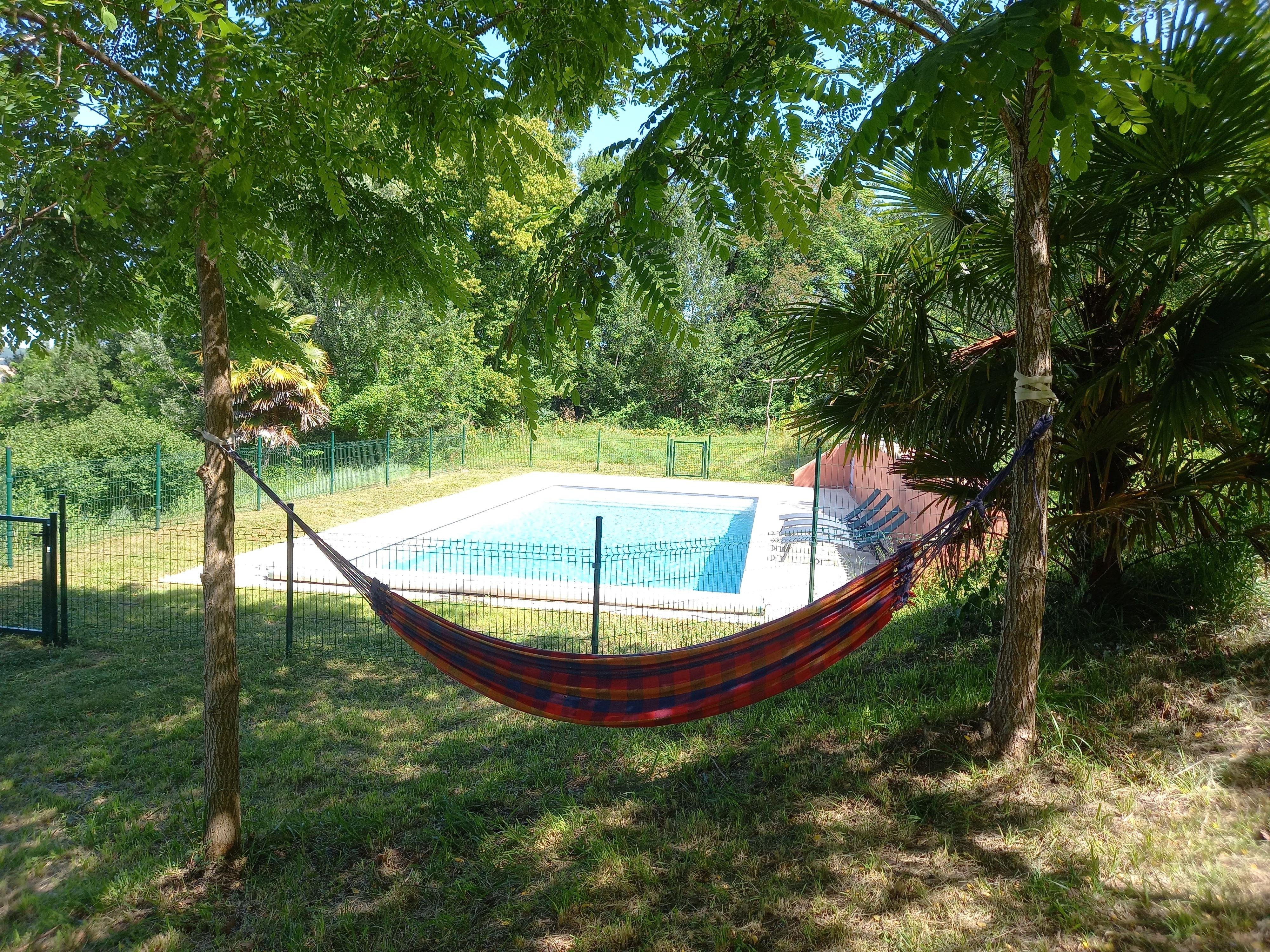 Vous avez également accès à notre grande piscine partagée, longue de 11 mètres. Nichée à l’écart et sans vis-à-vis, elle offre une vue imprenable sur la campagne environnante — un lieu paisible et ressourçant, idéal pour profiter pleinement des beaux jours.