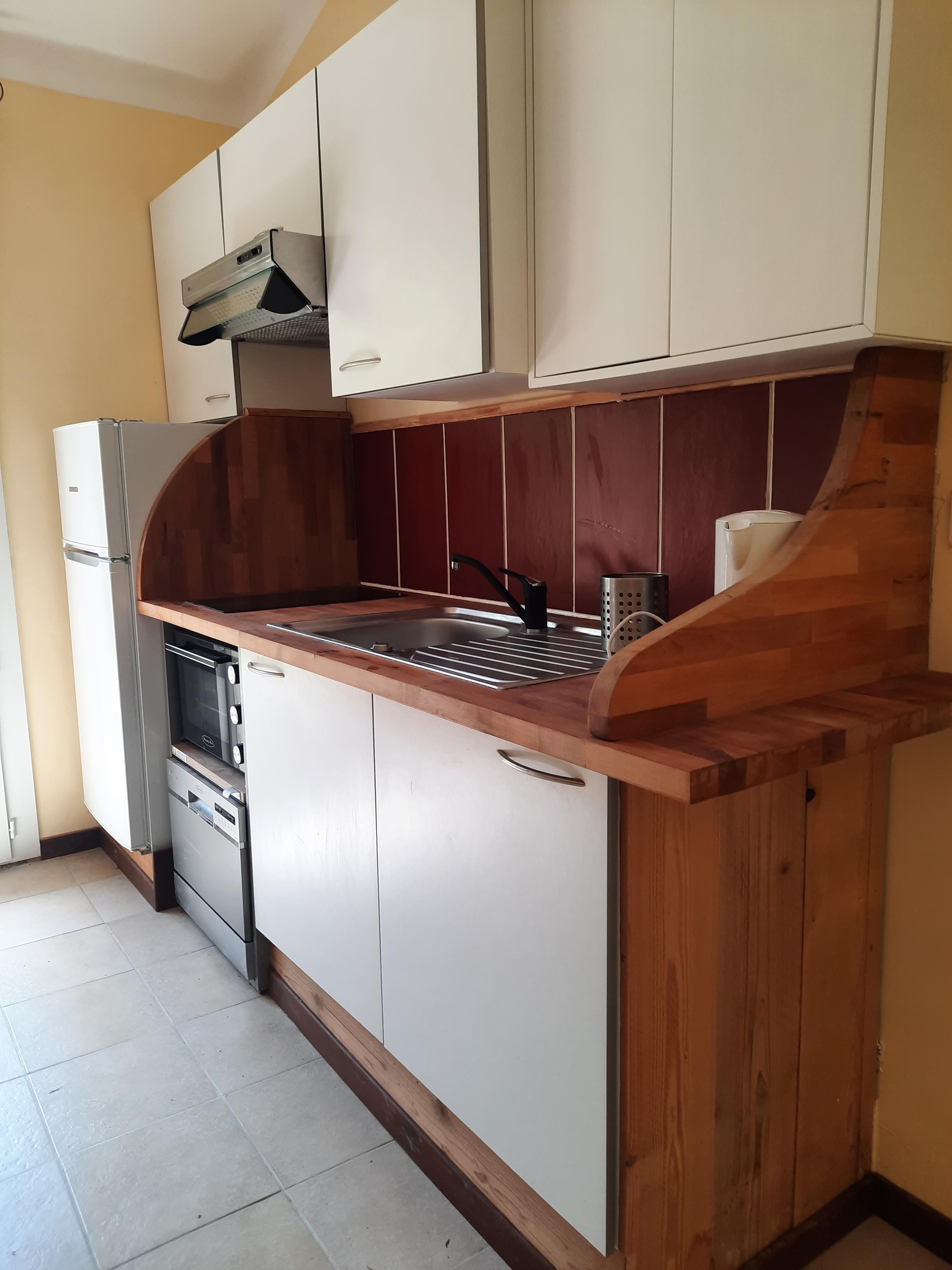 La cuisine dispose de tout le nécessaire pour un séjour en autonomie : lave-vaisselle, lave-linge, four micro-ondes, plaques vitro-céramiques, réfrigérateur et ustensiles de base.