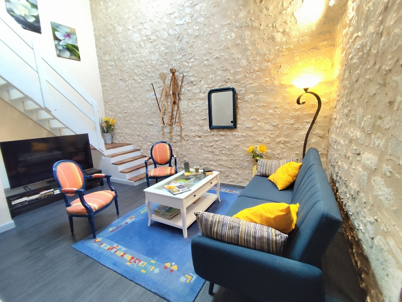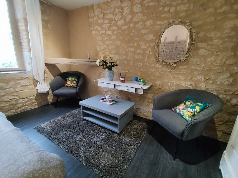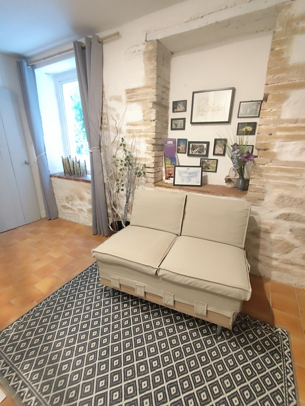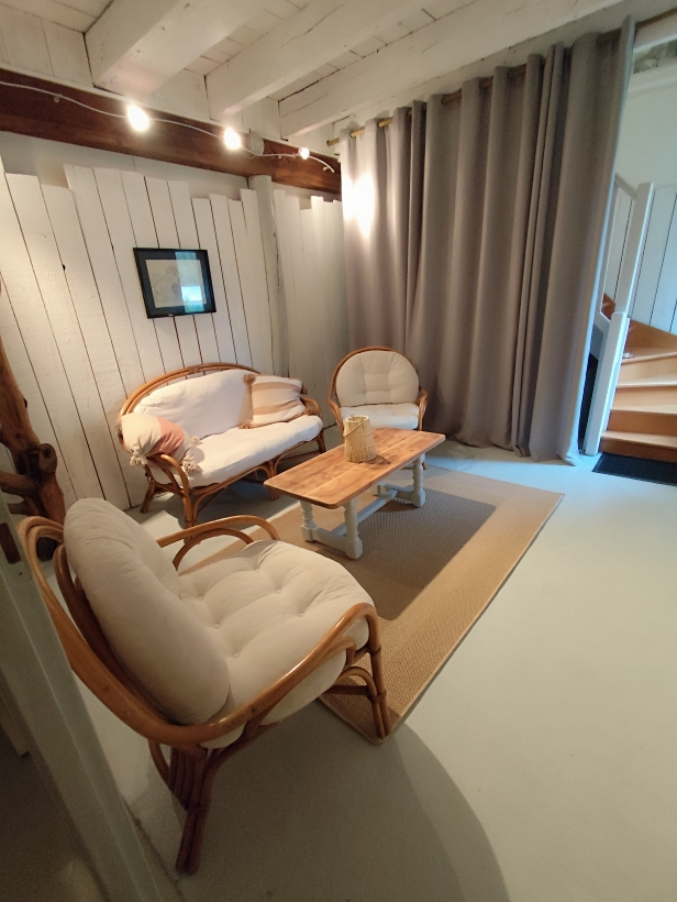 A comfortable living room of 21m². Fireplace with insert, 1 sofa 3 places and 3 armchairs, 1 coffee table, 1 bookcase with leaflets and tourist brochures, flat screen television, Wifi.