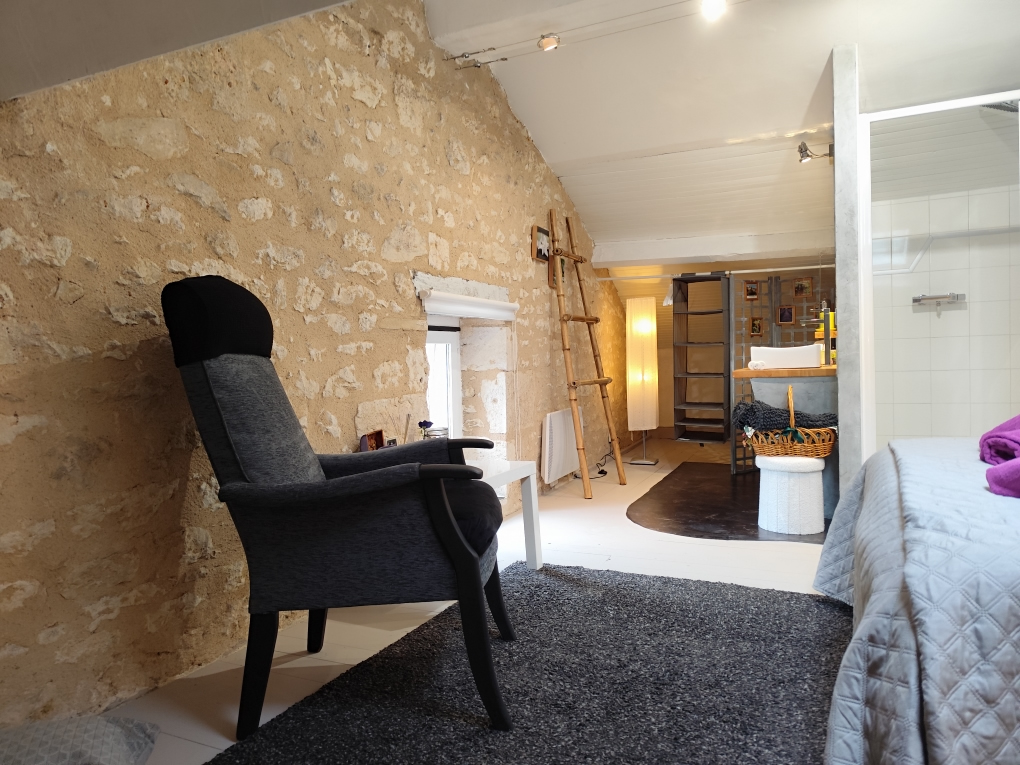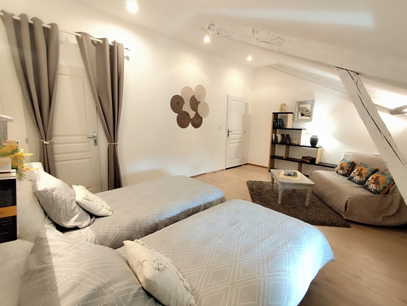 1st room 16 m², 1 bed (160cm). Sheets provided. 1 wardrobe, 2 bedside tables, 2 armchairs, 1 pouffe and 1 wall table.