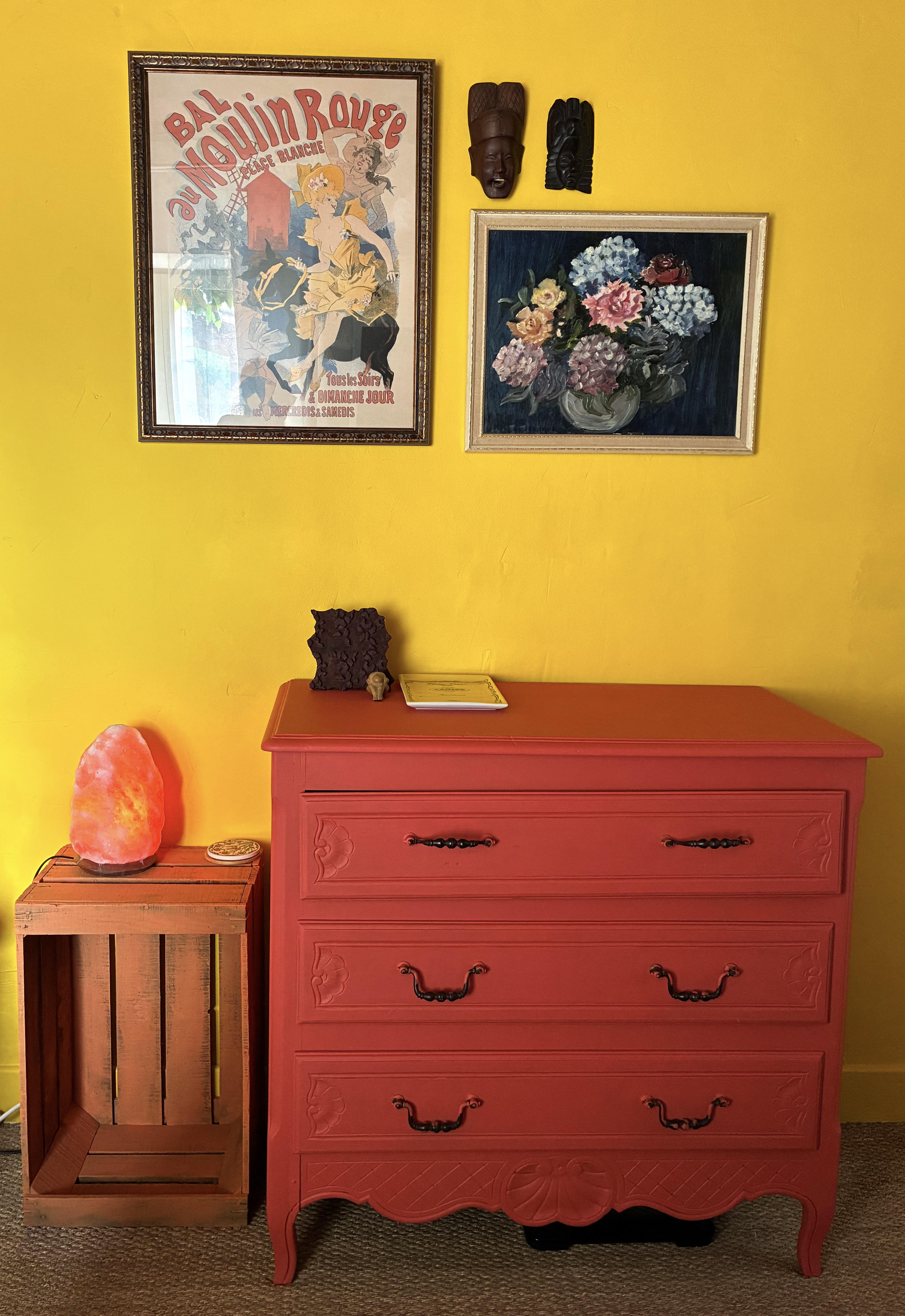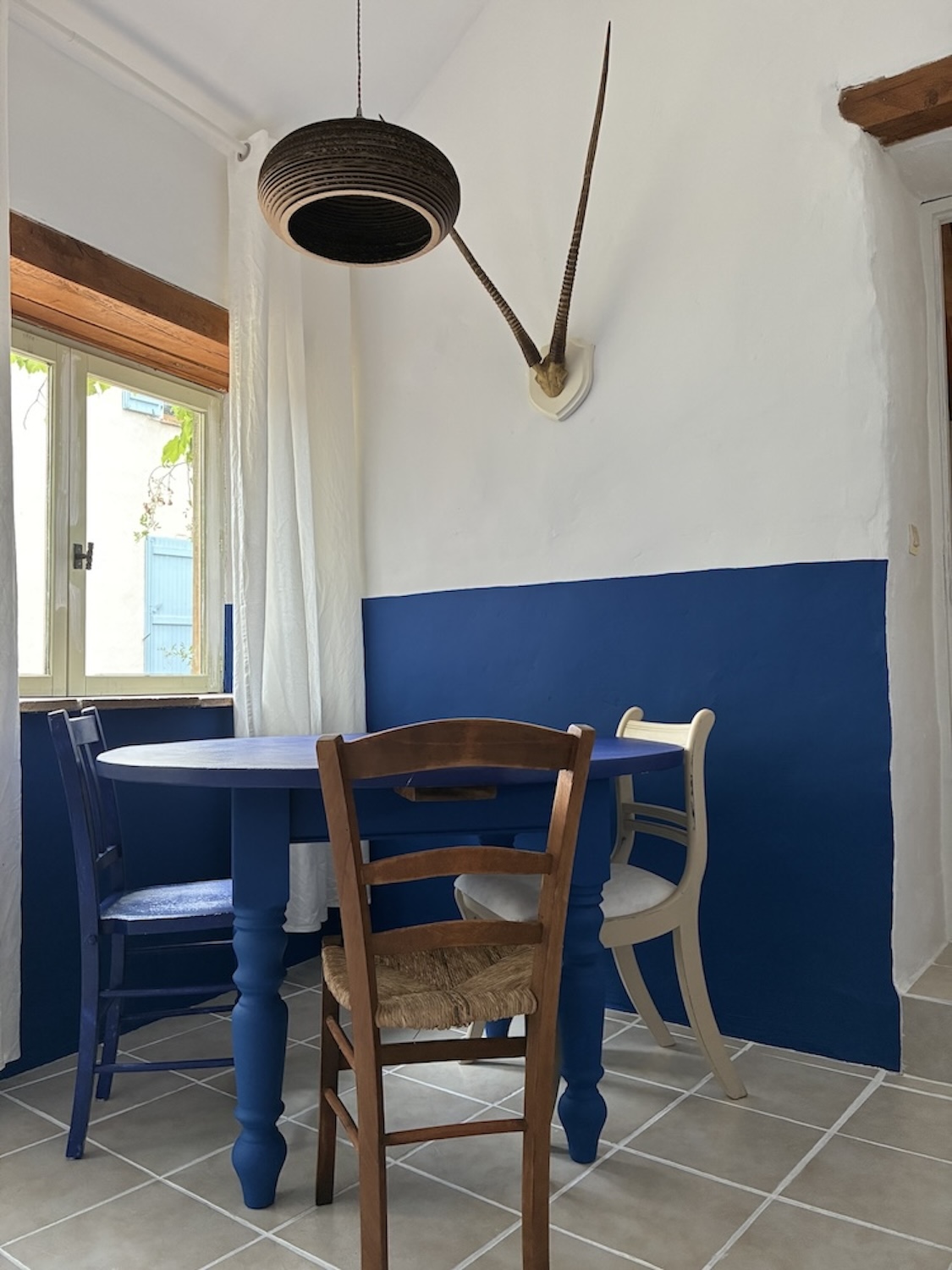 Le charme rustique français authentique se révèle à travers les murs de pierre d’origine et les poutres apparentes, subtilement mêlé à une esthétique éclectique. Des influences mondiales contemporaines aux lignes Bauhaus épurées se marient en un jeu de motifs audacieux, de textures riches et de confort moderne.