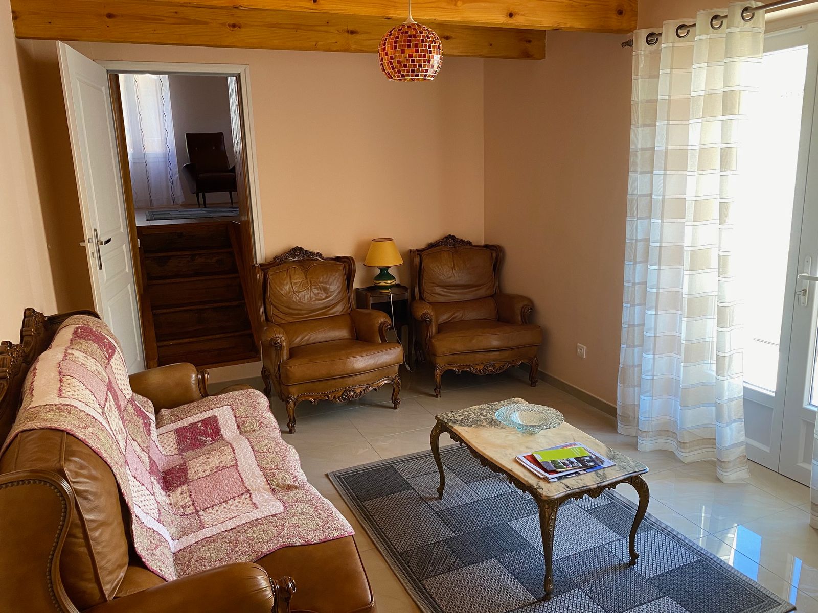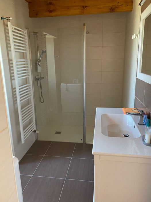 After parking in front of the gîte, go down 5 steps to reach the accommodation. You enter a fully equipped kitchen (fitted units, microwave, washing machine), a lounge (sofa, TV armchairs, wifi, DVD player), a shower room and separate WC. Two bedrooms, each with 1 double bed (140cm). 6 steps to 3rd bedroom (1 double bed (140cm)). Terrace with garden furniture and barbecue. Shared shaded bowling green.