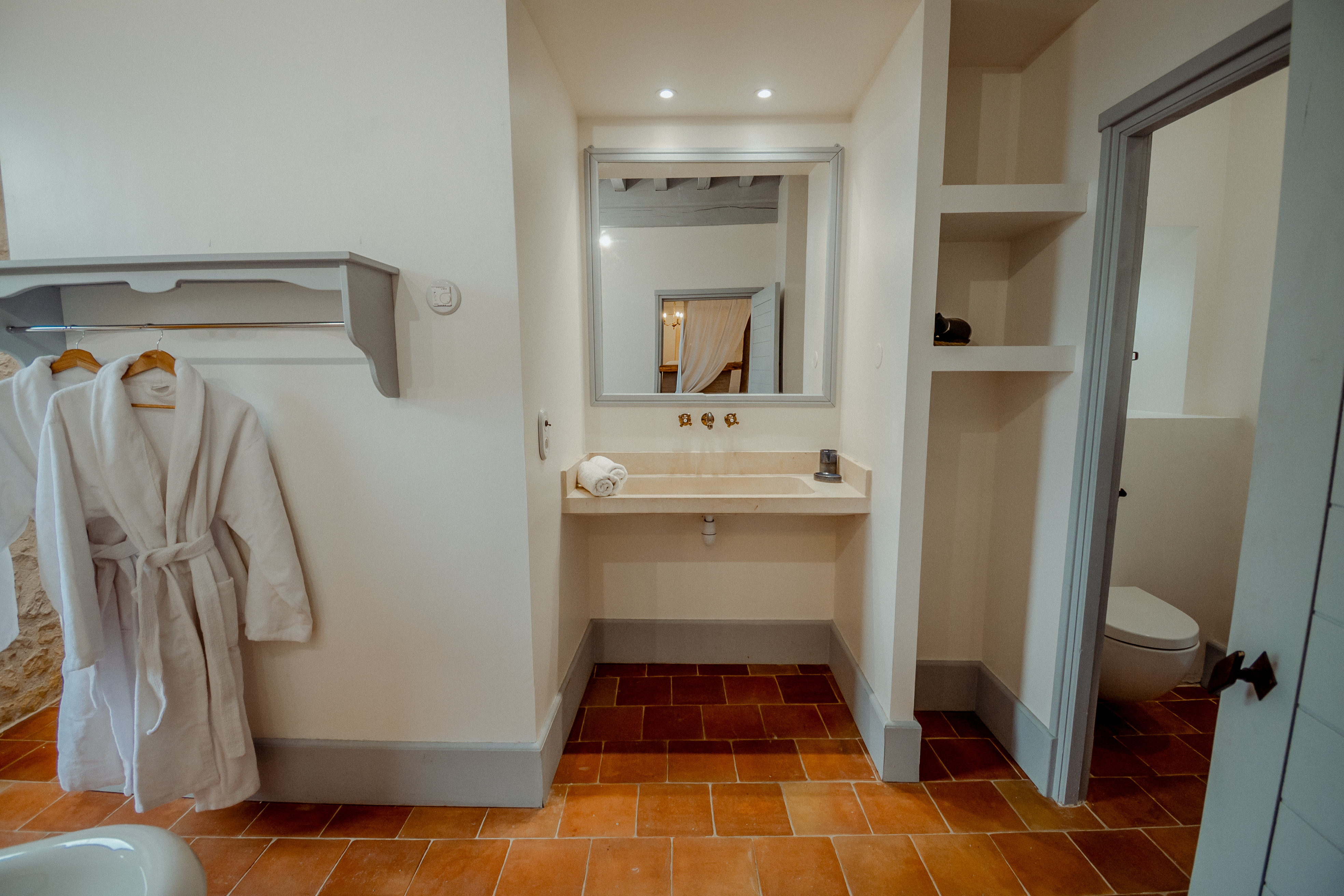À l’étage, accessible par son entrée indépendante, la lumière inonde la grande cuisine équipée (frigo, micro-ondes, cafetière, bouilloire, grille-pain, vaisselle essentielle…) : tout le nécessaire pour préparer vos repas. Une grande chambre double, décorée avec goût vous attend, ainsi qu’une salle de bain pleine de caractère, avec une superbe baignoire à pieds anciens au charme baroque.