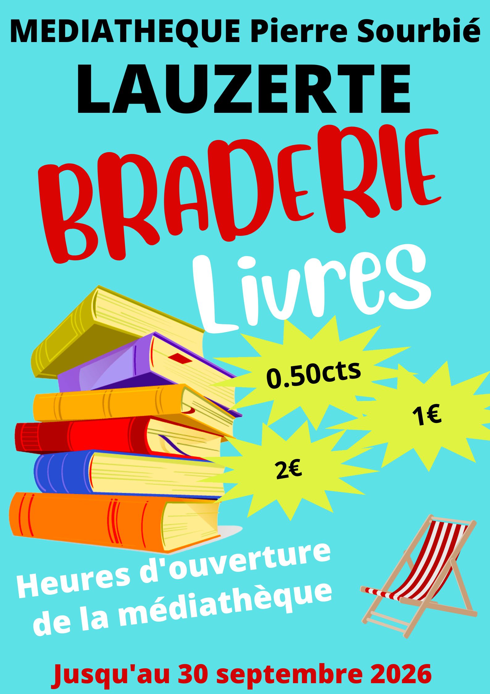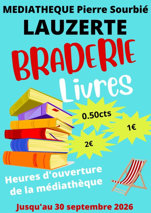 La médiathèque organise une braderie de livres afin de faire de la place sur les rayonnages du réseau et de renouveler ses collections. Les ouvrages proposés à la vente sont des livres sortis de notre fonds pour plusieurs raisons : certains sont devenus obsolètes, d'autres ont beaucoup circulé dans notre réseau, mais tous sont encore en bon état et peuvent tout à fait être relus et appréciés.