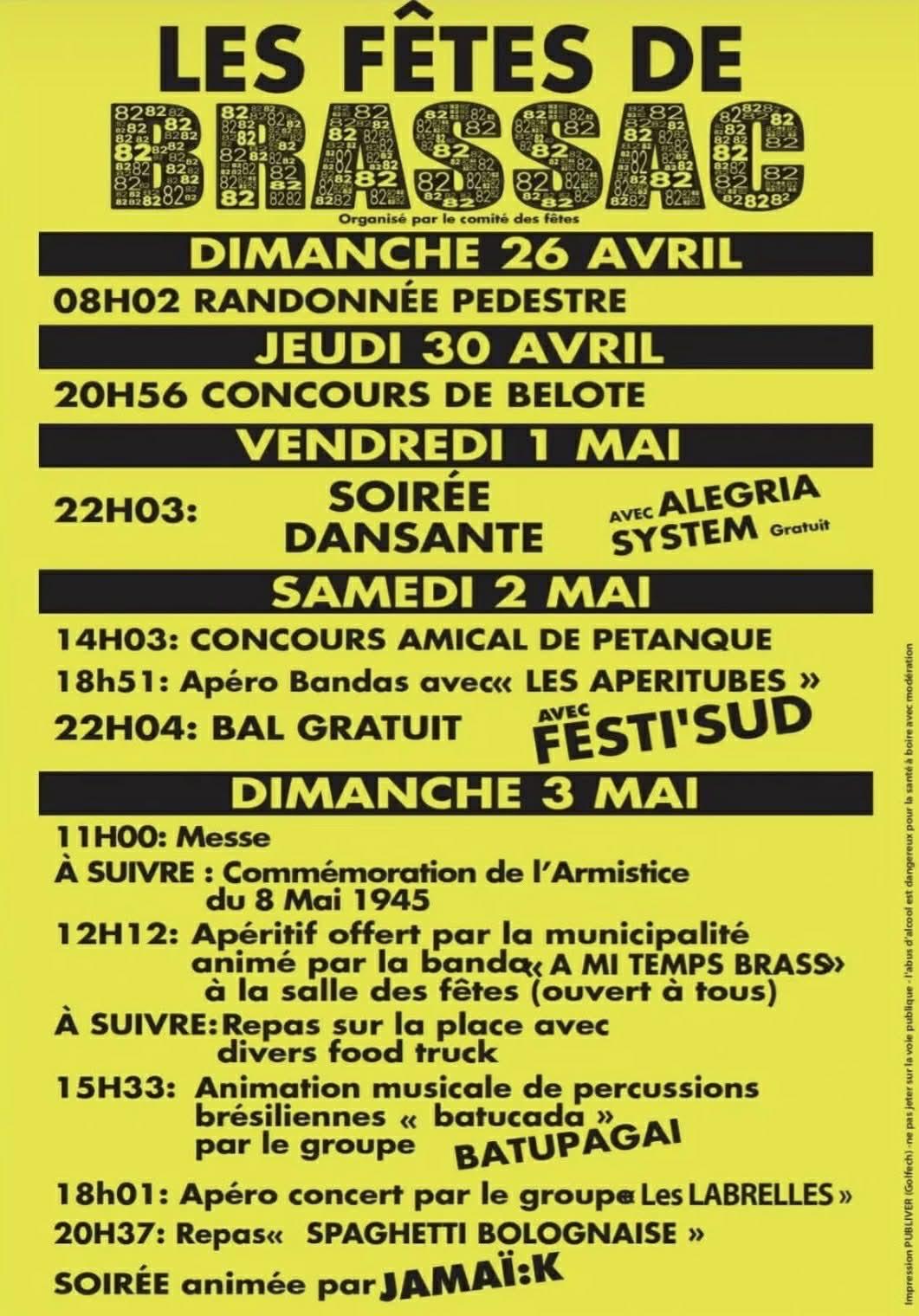 Le comité des fêtes de Brassac est heureux de vous informer de sa fête votive qui aura lieu le 26 avril ainsi que du 30 avril au 3 mai