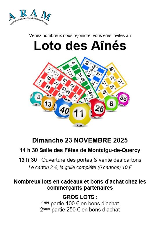 Loto des ainés de Montaigu de Quercy le 23 novembre à 14h30 à la salle des fêtes