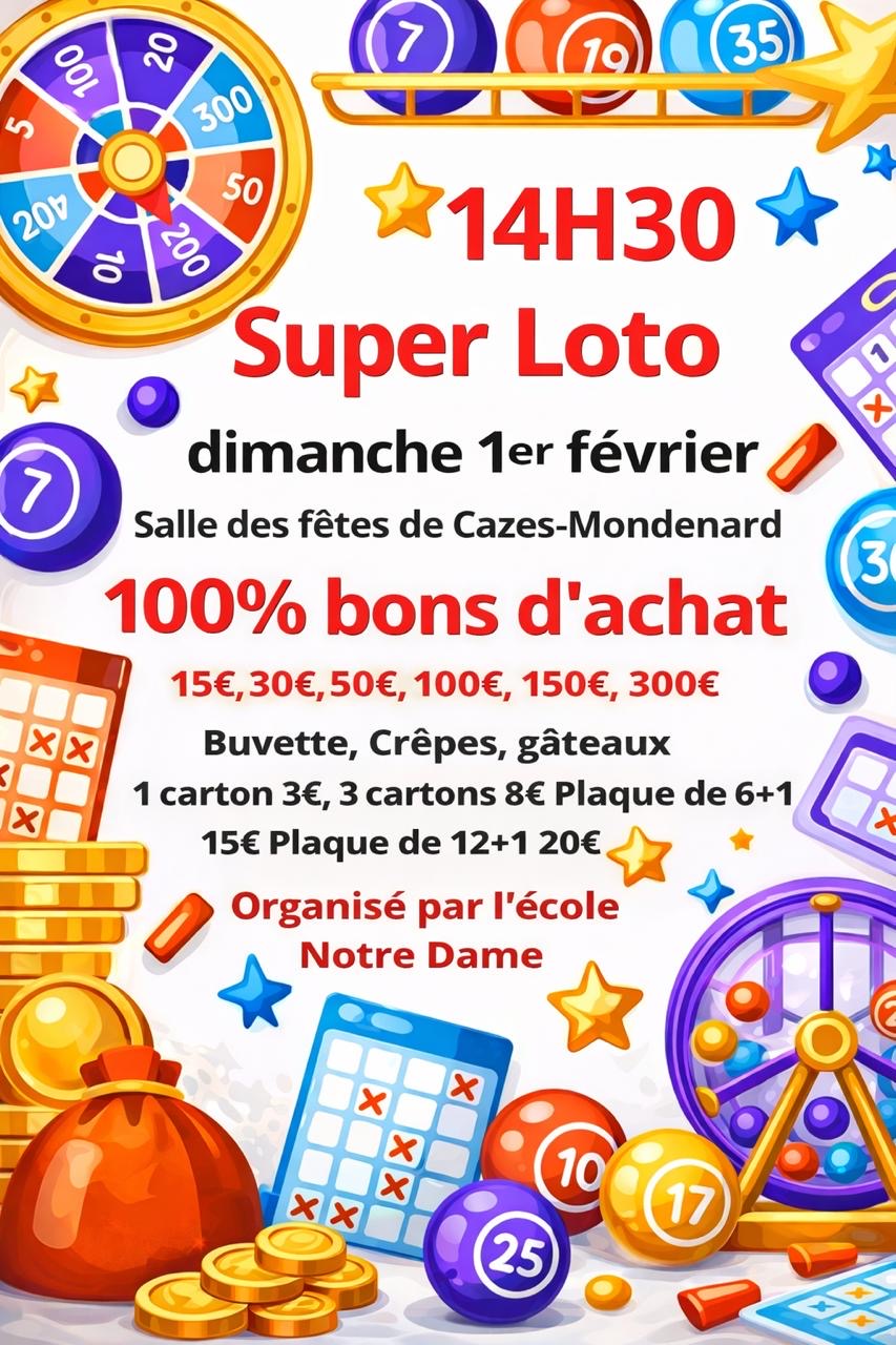 Loto100% bons d'achats Bénéfices pour l'école Notre-Dame de CazesLoto avec comme lots à gagner : 100% bons d'achats !