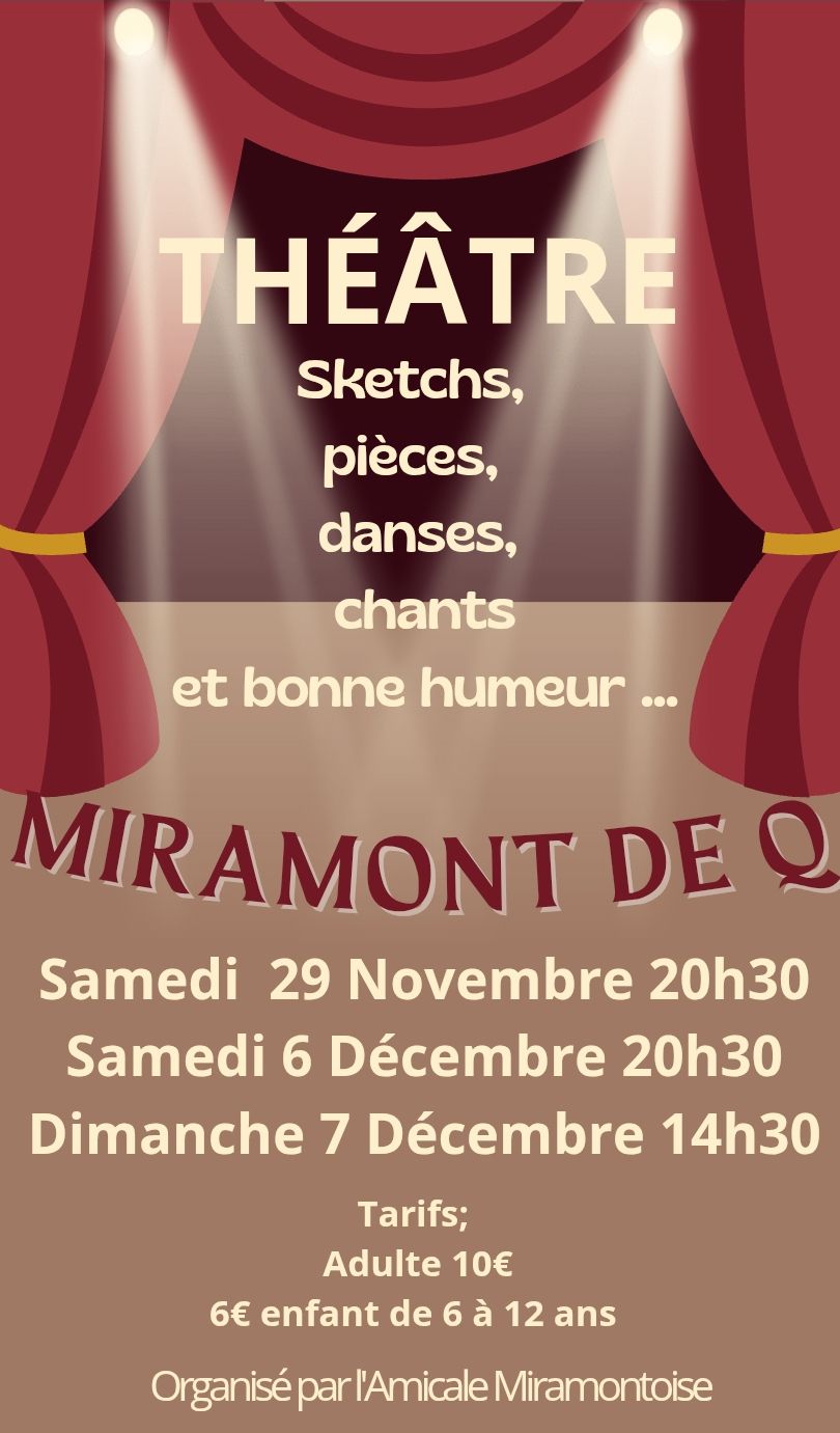Venez découvrir la magie du théâtre local lors des soirées exceptionnelles organisées par l'Amicale Miramontoise à Miramont-de-Quercy. Marquez vos agendas pour les 29 novembre, 6 et 7 décembre prochains