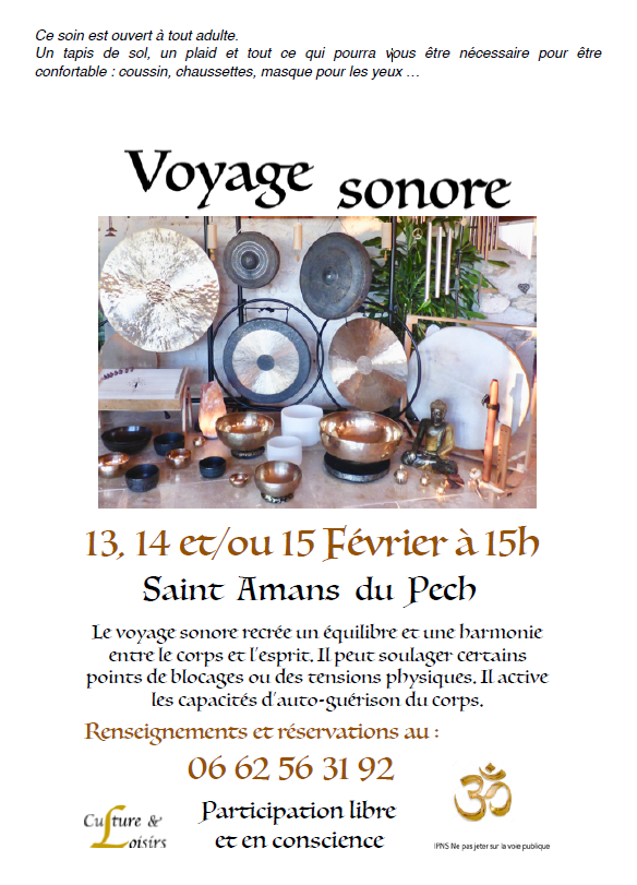 L'association « Culture et Loisirs » vous propose un voyage vibratoire au son des bols tibétains, bol de cristal, tambours, gongs, carillons, ainsi que la voix.