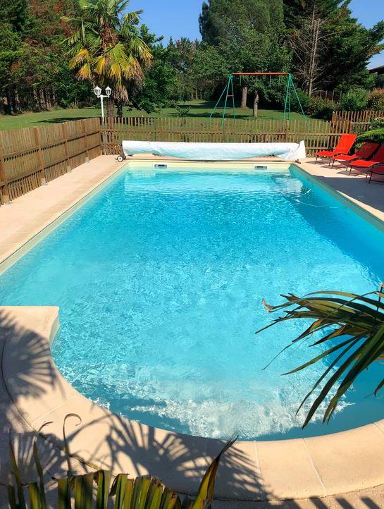 La piscine 10X5, filtration au sel, sécurisée par une barrière, adaptée aux enfants, chauffée de mai à octobre
