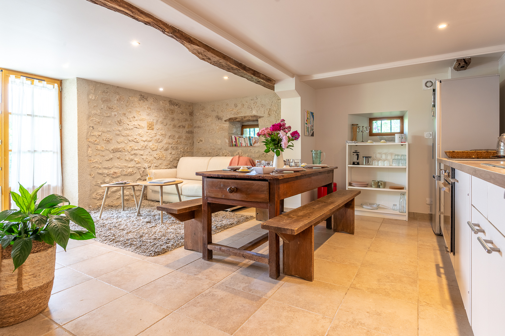 Vous êtes ici chez vous, dans un espace récemment rénové dans la tradition quercynoise : poutres et vieilles pierres donnent à ce lieu un charme tout particulier.