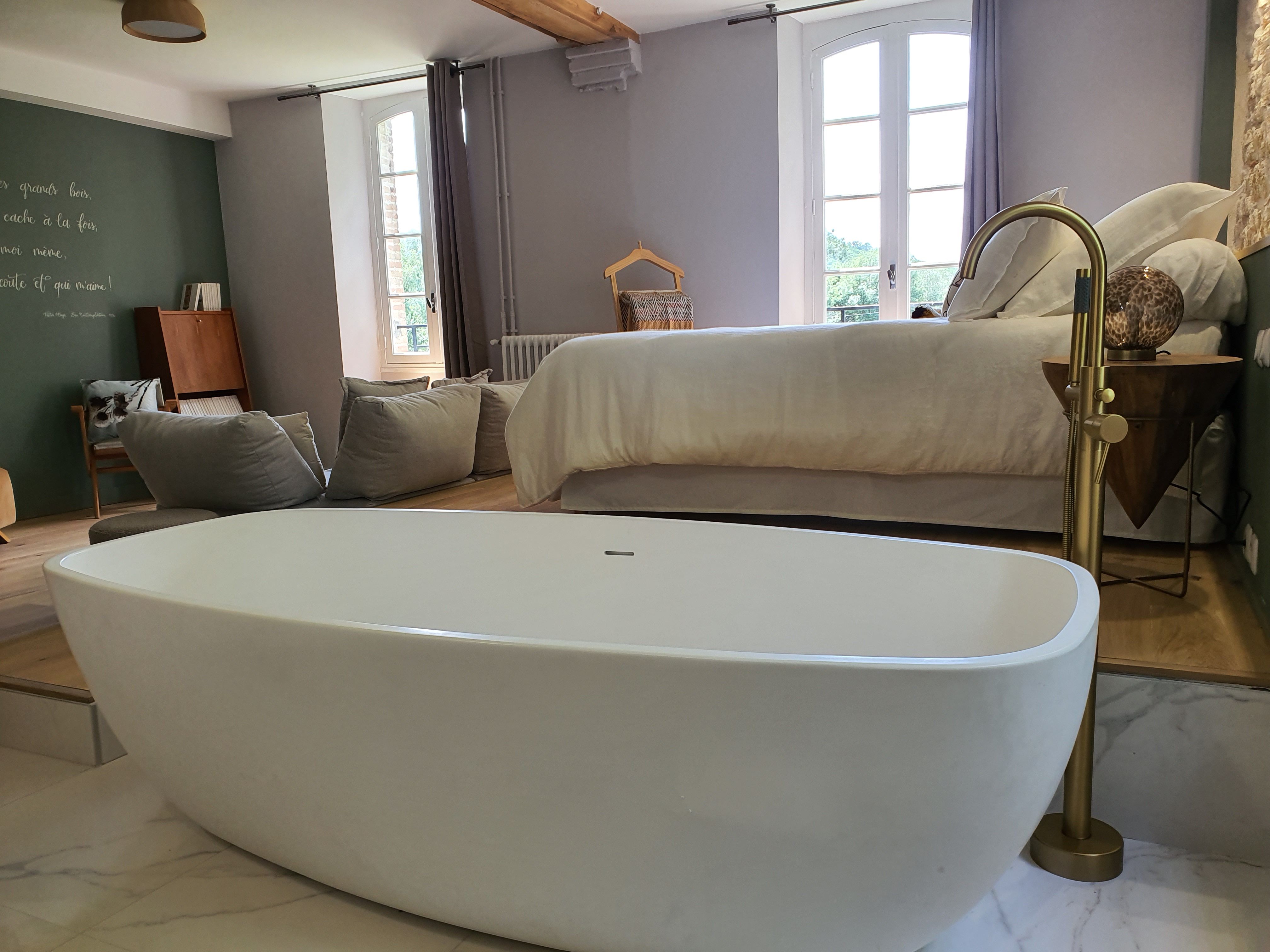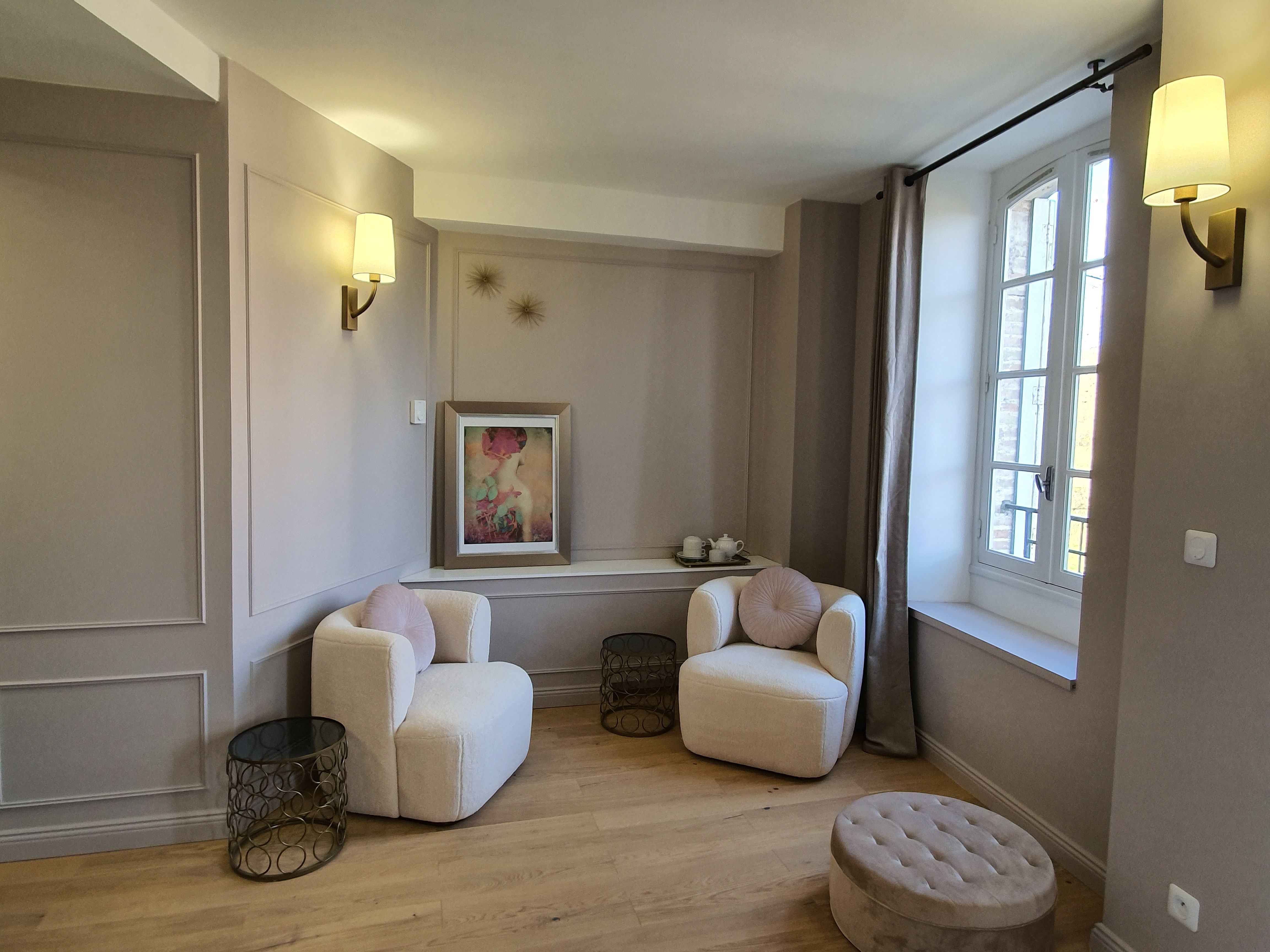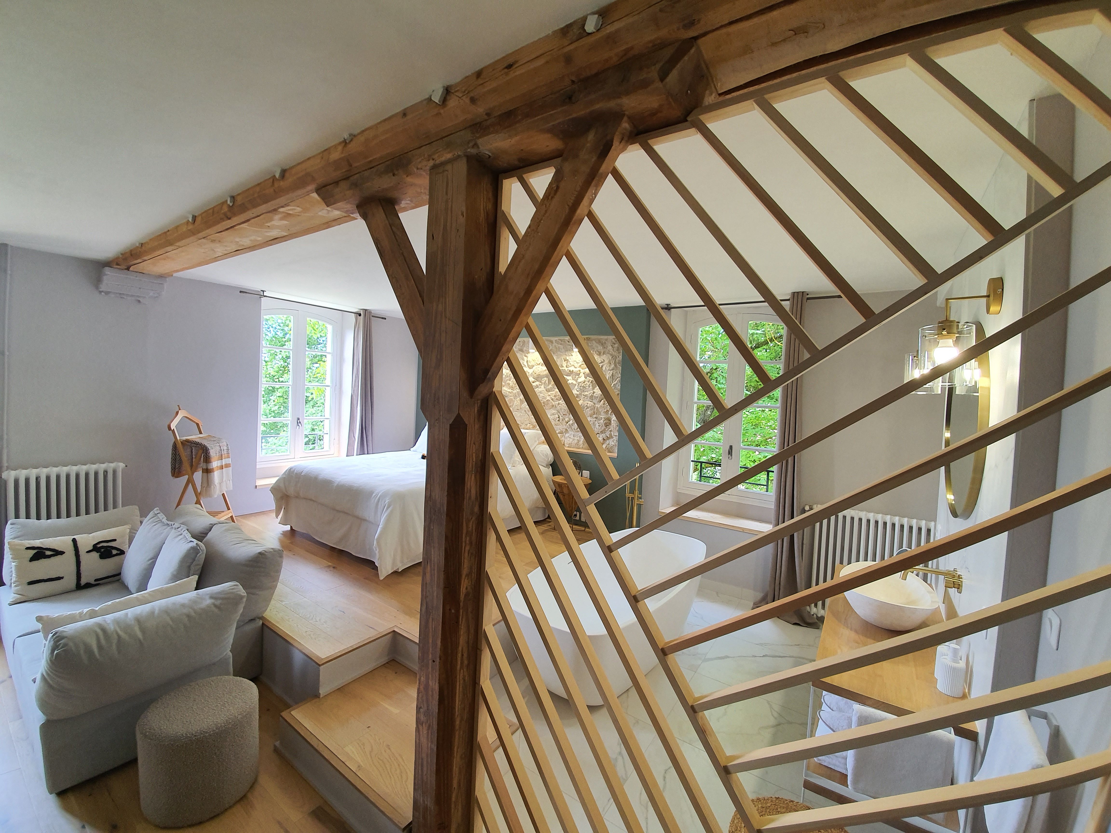 Au 1er étage du moulin, 2 chambres de part et d'autre du hall d'entrée avec pour la chambre Adélaïde bénéficie d'un grand balcon. On y trouve un grand lit (180), une baignoire, une salle d'eau ouverte avec douche et wc privatifs fermés. Fauteuils, mobilier d'appoint, rangement. La chambre Alexandrine, sur le même concept avec un grand lit (180), une baignoire, une salle d'eau ouverte douche et wc privés fermés. Espace salon avec canapé et lit d'appoint. Mobilier d'appoint, rangement. La chambre Victoria, sur le même concept avec un grand lit (180), une baignoire ronde mise en scène sur une estrade, une salle d'eau douche et wc privés fermés. Espace salon avec banquette qui peut faire lit d'appoint, fauteuil, rangement. Wifi et plateau de courtoisie dans chaque chambre.Wifi dans la chambre, TV.Wifi et plateau de courtoisie dans chaque chambre. Petit plus : Le prix de la chambre comprend 45 minutes de jacuzzi.