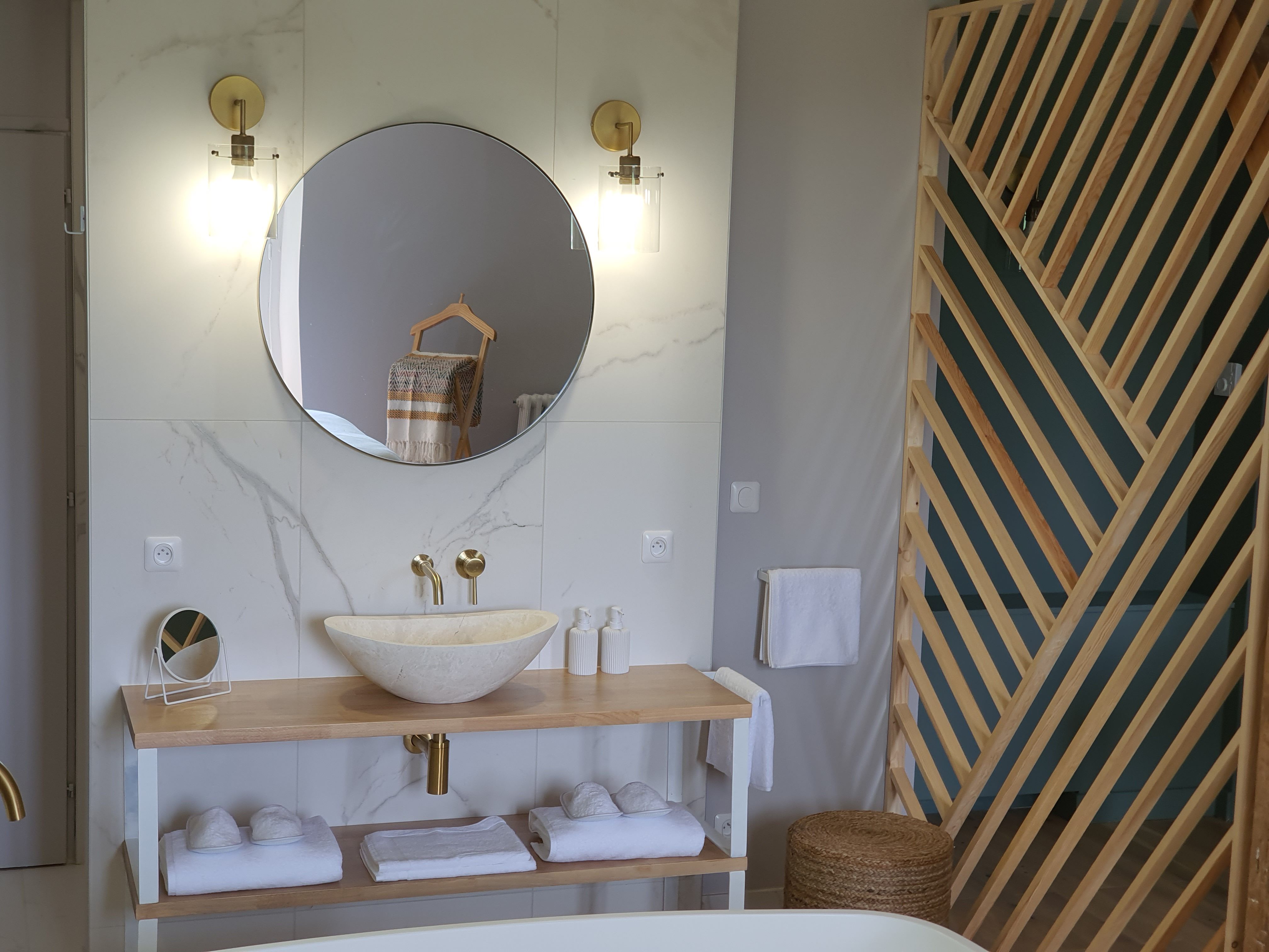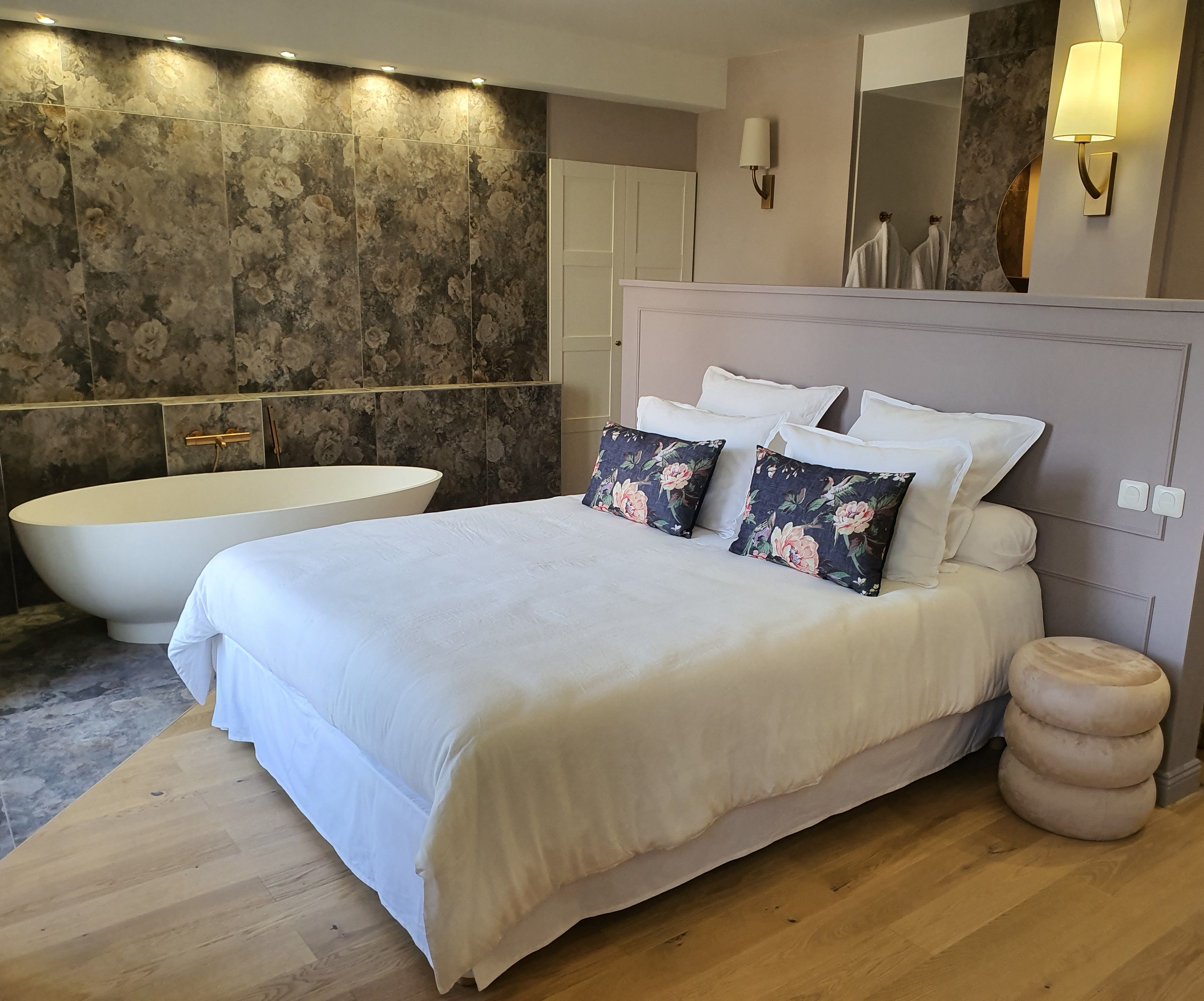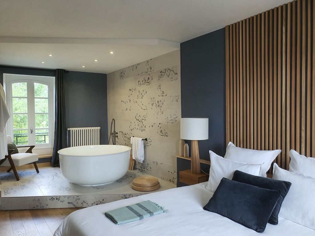 Au 1er étage du moulin, 2 chambres de part et d'autre du hall d'entrée avec pour la chambre Adélaïde bénéficie d'un grand balcon. On y trouve un grand lit (180), une baignoire, une salle d'eau ouverte avec douche et wc privatifs fermés. Fauteuils, mobilier d'appoint, rangement. La chambre Alexandrine, sur le même concept avec un grand lit (180), une baignoire, une salle d'eau ouverte douche et wc privés fermés. Espace salon avec canapé et lit d'appoint. Mobilier d'appoint, rangement. La chambre Victoria, sur le même concept avec un grand lit (180), une baignoire ronde mise en scène sur une estrade, une salle d'eau douche et wc privés fermés. Espace salon avec banquette qui peut faire lit d'appoint, fauteuil, rangement. Wifi et plateau de courtoisie dans chaque chambre.Wifi dans la chambre, TV.Wifi et plateau de courtoisie dans chaque chambre. Petit plus : Le prix de la chambre comprend 45 minutes de jacuzzi.
