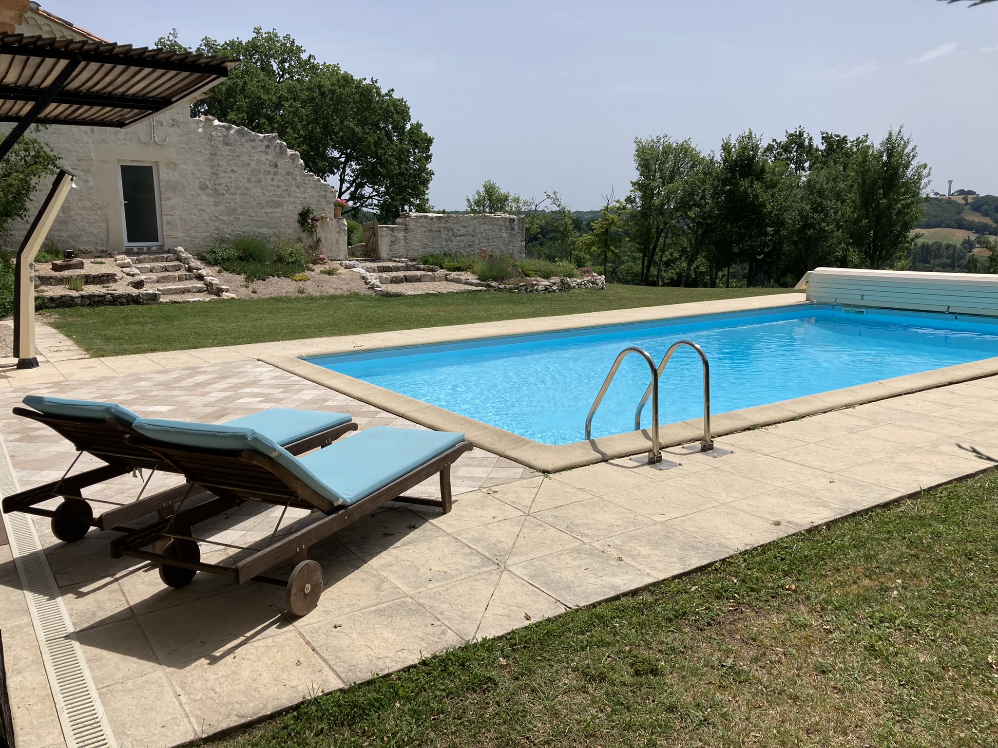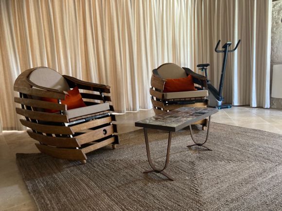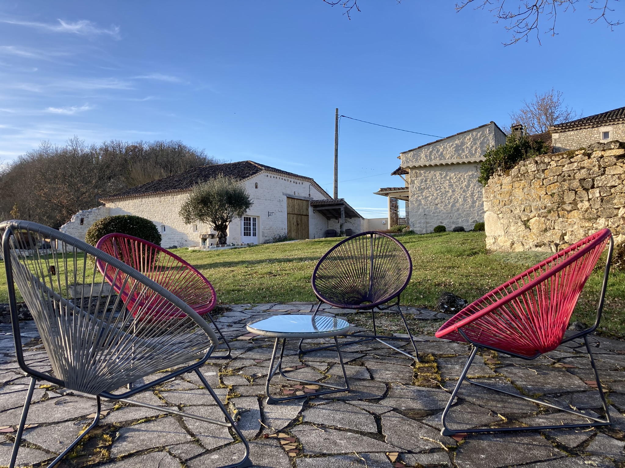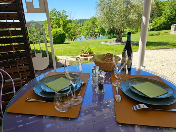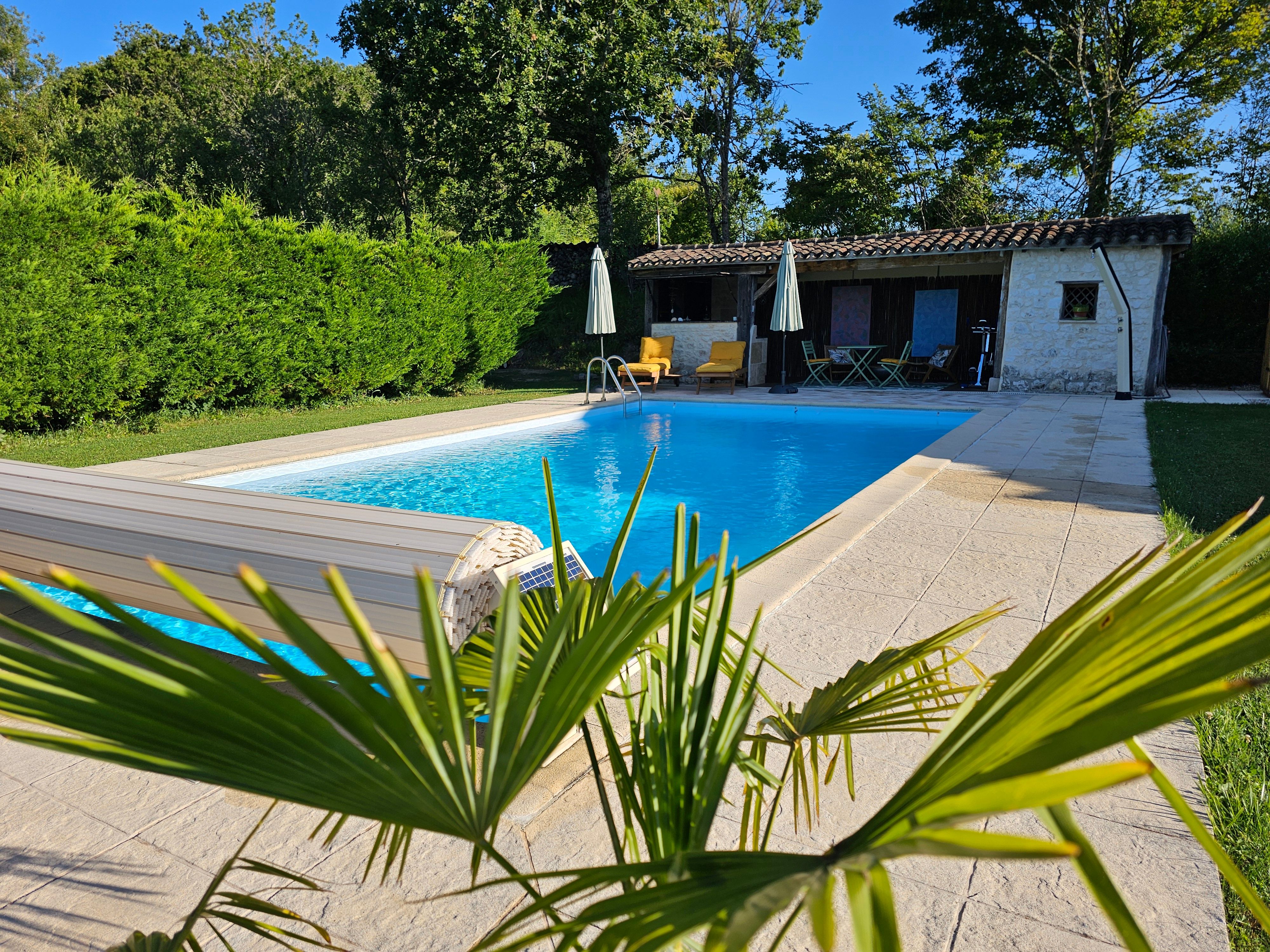 Tout un ensemble fait de plusieurs bâtiments composent ce lieu magique : dans le premier bâtiment, une cuisine intégrée (lave-vaisselle, lave-linge, micro-ondes, four, plaque, hotte, réfrigérateur), table haute avec tabourets, une chambre (lit King size pouvant être séparé en lits jumeaux, tables de nuits, fauteuils, table basse, armoire), une salle d'eau avec wc et une terrasse avec table et chaises. Dans la grange annexe, un salon avec fauteuils, TV, jeux de société, table de ping-pong, vélo d'appartement, livres. le tout exclusivement réservé et privatif aux hôtes. De cette grange accès direct à la piscine avec sa cuisine d'été complète exclusivement réservée aux hôtes, aquabike et toilettes sèches. Wifi dans tout le logement y compris dans la grange, près de la piscine et sur les terrasses. Piscine (10X5 avec fosse à plonger 2,50m), bains de soleil, parasols, aquabike. Linge de lit, de toilette, de maison, foutas pour la piscine mis à disposition et inclus. Un adoucisseur d'eau alimente le gîte, la cuisine d'été et la douche solaire. Terrasse panoramique avec point de vue sur le golf des Roucous de Sauveterre (mobilier de jardin). Equipement pour bébé sur demande (lit parapluie, linge de lit, chaise haute, vaisselle adaptée, baignoire). Sur place borne de recharge électrique pour véhicule électrique ou hybride.