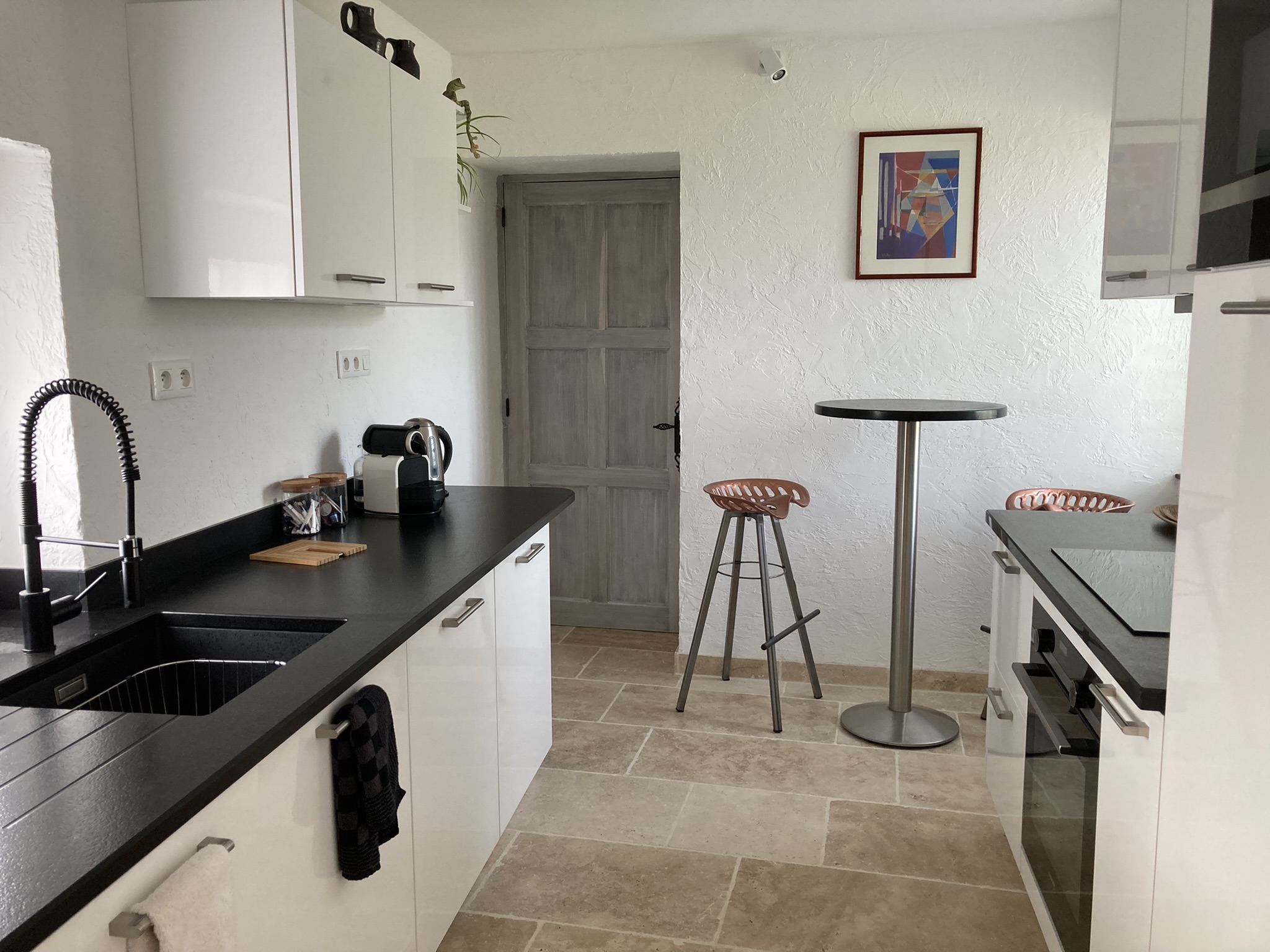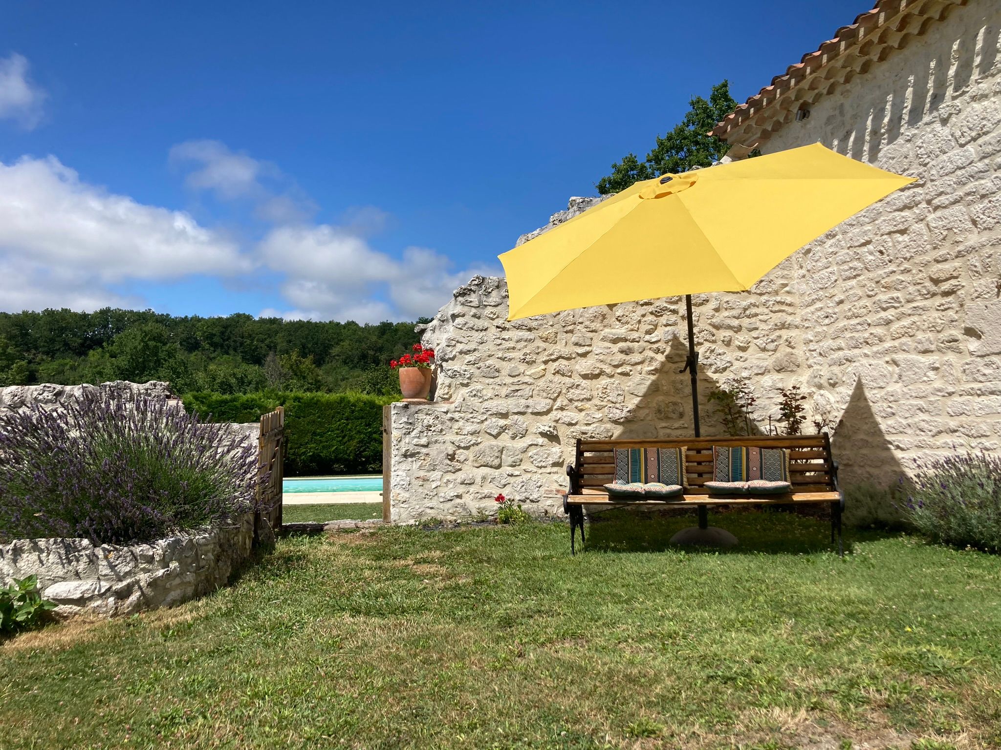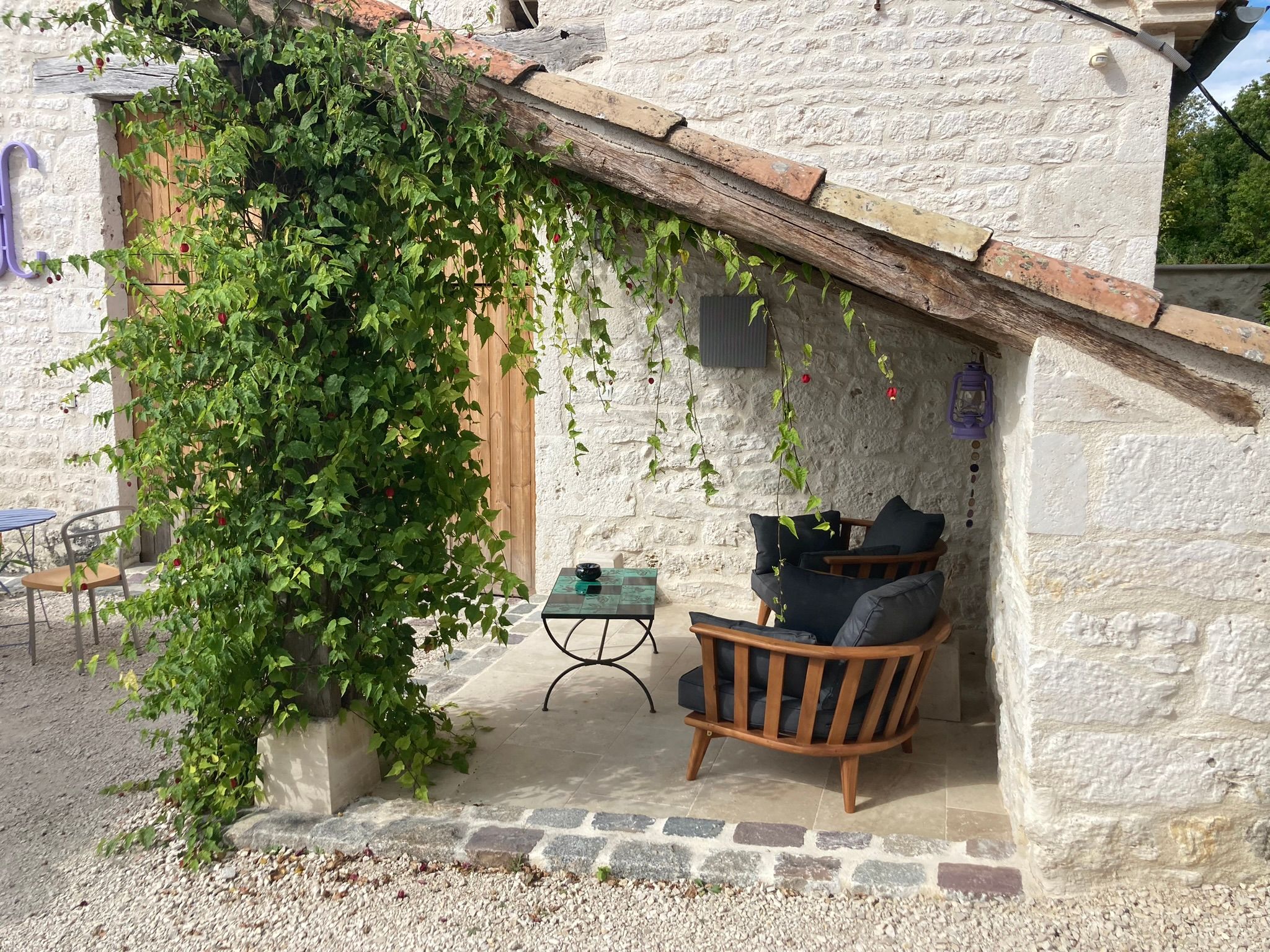 Tout un ensemble fait de plusieurs bâtiments composent ce lieu magique : dans le premier bâtiment, une cuisine intégrée (lave-vaisselle, lave-linge, micro-ondes, four, plaque, hotte, réfrigérateur), table haute avec tabourets, une chambre (lit King size pouvant être séparé en lits jumeaux, tables de nuits, fauteuils, table basse, armoire), une salle d'eau avec wc et une terrasse avec table et chaises. Dans la grange annexe, un salon avec fauteuils, TV, jeux de société, table de ping-pong, vélo d'appartement, livres. le tout exclusivement réservé et privatif aux hôtes. De cette grange accès direct à la piscine avec sa cuisine d'été complète exclusivement réservée aux hôtes, aquabike et toilettes sèches. Wifi dans tout le logement y compris dans la grange, près de la piscine et sur les terrasses. Piscine (10X5 avec fosse à plonger 2,50m), bains de soleil, parasols, aquabike. Linge de lit, de toilette, de maison, foutas pour la piscine mis à disposition et inclus. Un adoucisseur d'eau alimente le gîte, la cuisine d'été et la douche solaire. Terrasse panoramique avec point de vue sur le golf des Roucous de Sauveterre (mobilier de jardin). Equipement pour bébé sur demande (lit parapluie, linge de lit, chaise haute, vaisselle adaptée, baignoire). Sur place borne de recharge électrique pour véhicule électrique ou hybride.